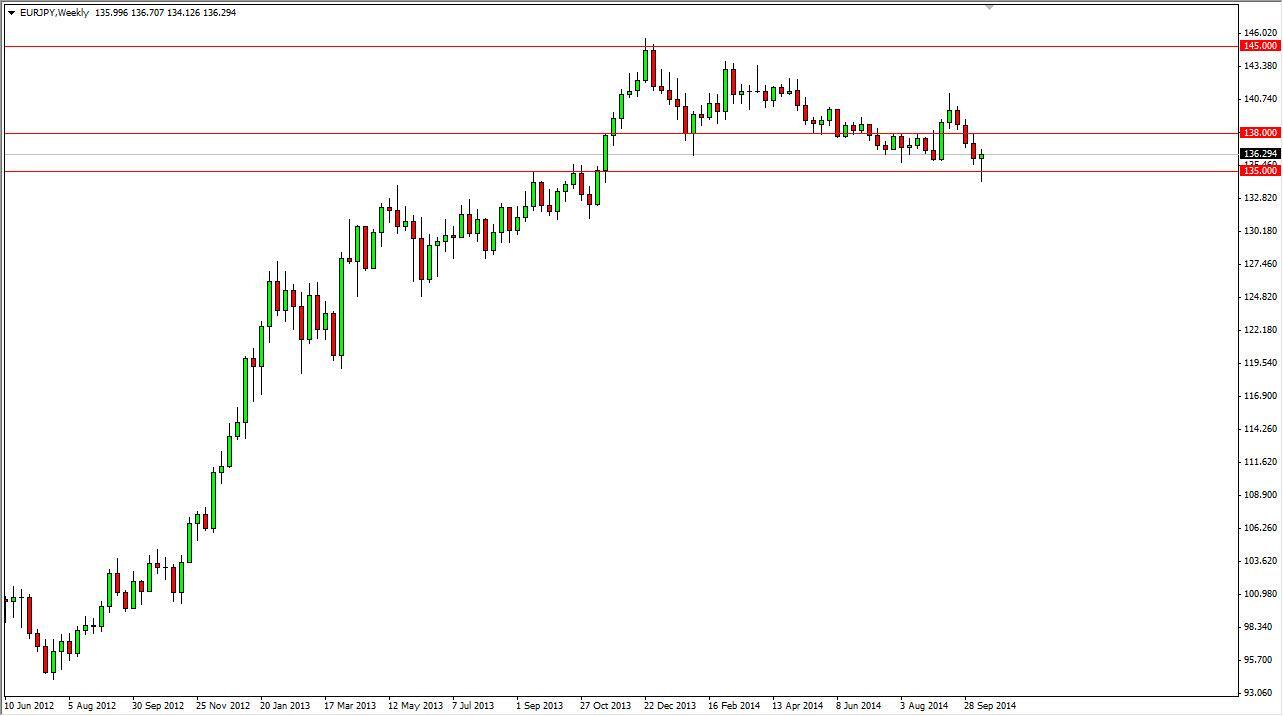 The EUR/JPY pair did in fact fall initially during the course of the week, but tested the 135 level for support. The resulting support ended up sending the market higher, forming a hammer. The hammer of course is very well-placed, based upon the longer-term movement of this marketplace. With that, on a break above the top of the candle we believe that the market will first attempt the 138 handle, and then the 140 handle on its way to the 145 level. We have no plans whatsoever on selling this market.