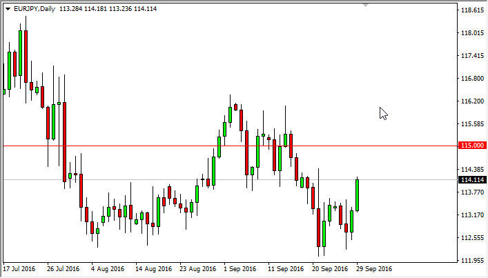 The EUR/JPY pair broke higher during the course of the session on Thursday, and rallied quite stringently. I believe at this point in time though, there is going to be resistance above that will affect this market. The 115 level above will be an area where a lot of traders will be interested in, so between here and there, but we get an exhaustive candle I am more than willing to sell at that point in time. I do recognize however that there is going to be a certain amount of bullish pressure going forward, so short-term traders may be able to go either direction.