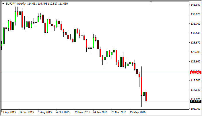 The EUR/JPY pair fell significantly during the course of the week, as we continue to see quite a bit of negativity when it comes to the Euro. After all, the market is very sensitive to risk appetite, and there are a lot of concerns in Europe at the moment. This is especially true in the banking sector, and with the United Kingdom voting to leave, this should only continue the bearish pressure when it comes to the Euro and of course the uncertainty. Rallies the show signs of exhaustion will be selling opportunities just as a break down to a fresh, new low will be.
