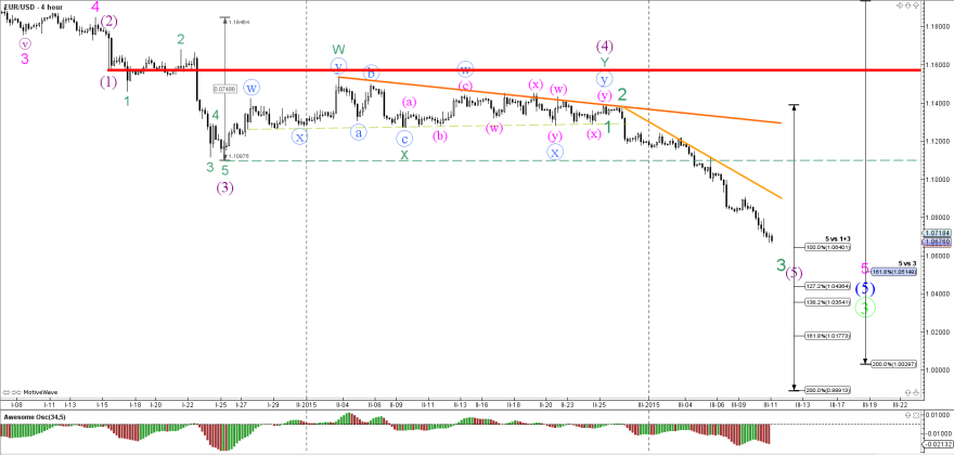 4 hour EURUSD: the momentum of wave 3 (green) keeps pushing price lower and lower. The Fibonacci targets of wave 5 suggest that price has more potential