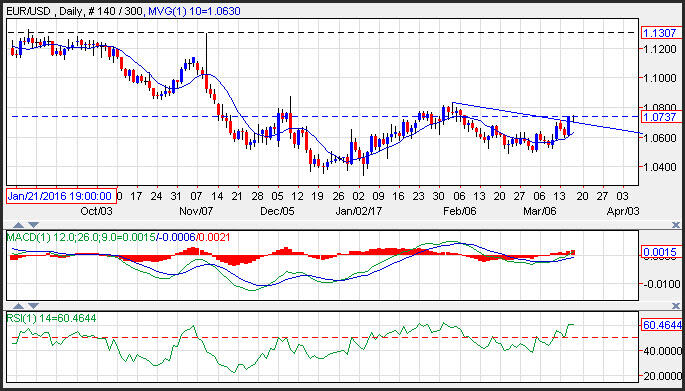 The EUR/USD moved higher after breaking out on Wednesday following the Fed’s decision to increase rates, and the Dutch elections that pealed back the view that the populist movement was spreading across Europe. The EURUSD rate sliced through trend line resistance near 1.0710, and is poised to test the February highs at 1.0829. Support on the Euro to the US dollar is seen near the 10-day moving average at 1.0629. Stronger than expected EU inflation also helped boost the currency pair.