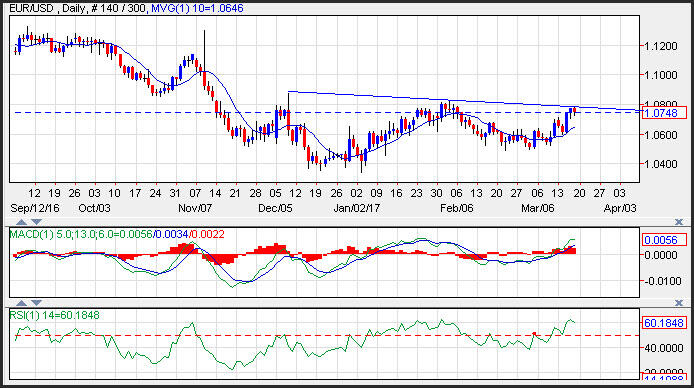 The EUR/USD edged lower on Friday after climbing for two consecutive trading session in the wake of the Federal Reserve meeting. Strong dollar comments from Treasury Secretary Mnuchin gave the greenback a boost. Resistance on the EURUSD chart is seen near a downward sloping trend line that comes in near 1.0785, and a break of this level would lead to a test of the February highs at 1.0829. Support on the Euro to US dollar is seen near the 10-day moving average at 1.0646.
