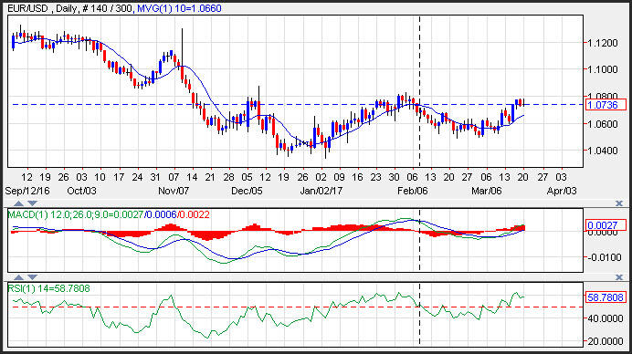 The EUR/USD continued to consolidate at higher levels, after pushing higher late last week in the wake of the Fed meeting. The exchange rate initially moved higher following hawkish comments from ECB officials. The divergent policy seems to be ending as ECB members are calling for a rate increase. Resistance on the EURUSD is seen near last week’s highs at 1.0782. Support on the Euro to US dollar chart is seen near the 10-day moving average at 1.0660. Momentum remains positive with the MACD (moving average convergence divergence) index printing in the black with an upward sloping trajectory.