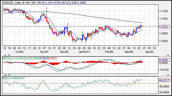 The EUR/USD edged lower on Thursday following a softer than expected German confidence report, and ahead of the U.S. House of Representative’s vote on the Healthcare bill. The EURUSD made a lower low, and is poised to test target support near the 10-day moving average at 1.0729. Resistance is seen near the February highs at 1.0829, and then the 200-day moving average at 1.0885. The change in tone from the ECB and the dovish bent following the Fed’s FOMC meeting has help the Euro to US dollar form a bottom.