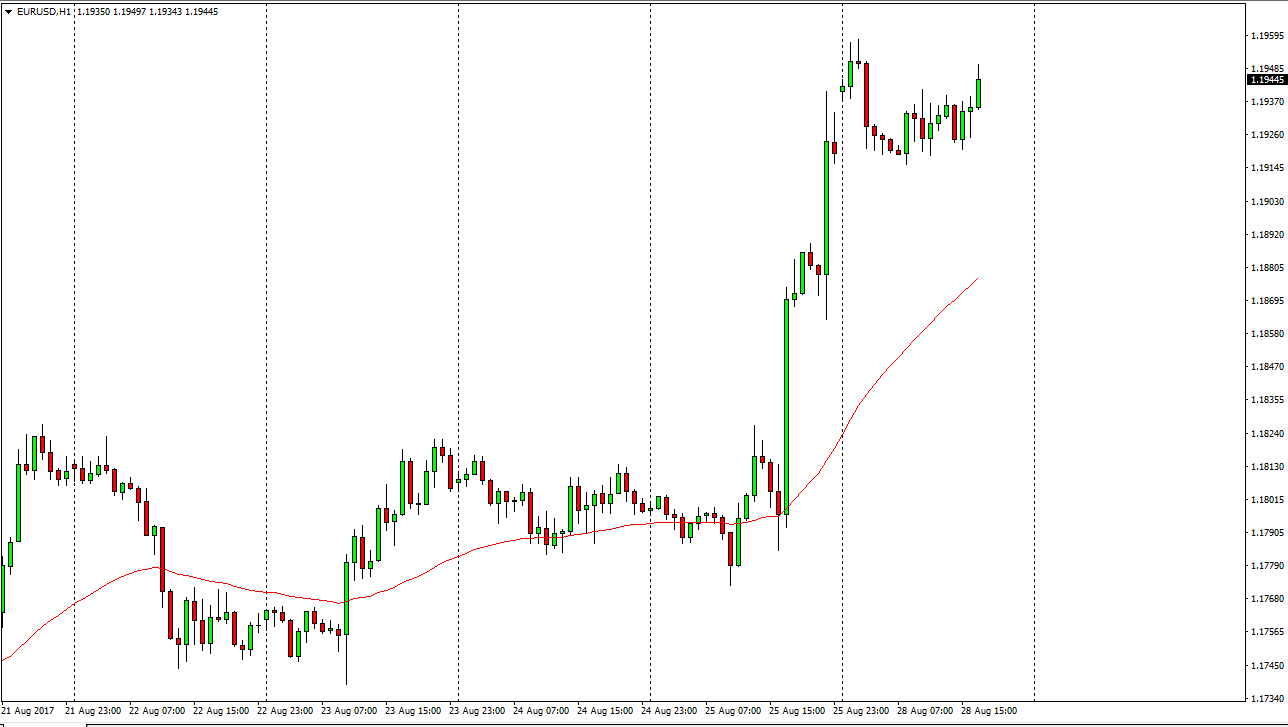 The EUR/USD pair gapped higher at the open on Monday, but then pulled back to fill that gap almost immediately. Now that we have fill that gap and continue to go higher, I think that the market is desperately trying to get towards the 1.20 level above. Ultimately, pullbacks continue to be buying opportunities, and I think that eventually we will build up the necessary momentum to clear the 1.20 level. Once we do, the market should become very aggressively looking towards the 1.25 handle above which is my longer-term target. We had recently broke out of a 3-year consolidation area, and measuring that rectangle suggests that 1.25 target.
