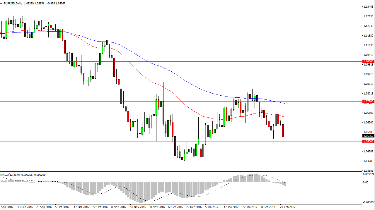 The EUR/USD pair fell slightly during the day on Wednesday, testing the 1.05 level. That’s an area that has been supportive in the past, so it makes sense that we might bounce from here. However, I see a lot of negativity in the moving averages, and I believe that there is a lot of fear when it comes to the potential results of the French election. After all, one of the strongest candidates once the leave the European Union. Bond traders are starting to bet against the European Union, signaling that they doubt it will even exist in a few years. Rallies that show signs of exhaustion near the red 50-day exponential moving average would be and I selling opportunity, but I must admit that if we break down below the bottom of a hammer, the market should then reach to the 1.0350 level underneath.