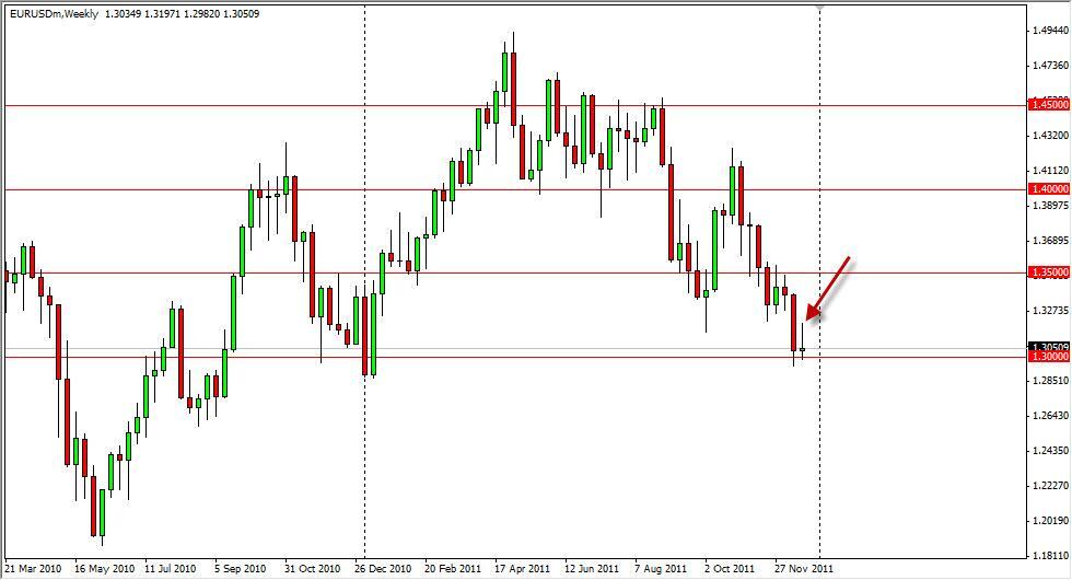 The resulting candle for the week is a doji, but closing lower than the open. The week did have at least some positive news coming out of Europe, but the reaction was muted. The lack of enthusiasm almost undoubtedly has to do with the fear of credit downgrades for the EU and its countries. If this comes about, we could see a real move to the downside in reaction. The S&P agency mentioned the fiscal union by name, and threatened to downgrade 15 of the countries in the union, as well as the EFSF bonds that are meant to bail everyone out. With this in the backdrop, there is a real chance that the Euro doesn’t move much, or even moves to the downside.