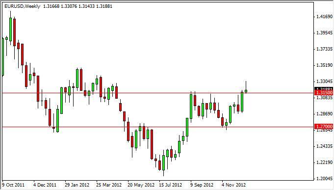 The EUR/USD pair shot up during the week, but pullback at the 1.33 handle in order to form a shooting star. This shooting star sits right on top of the