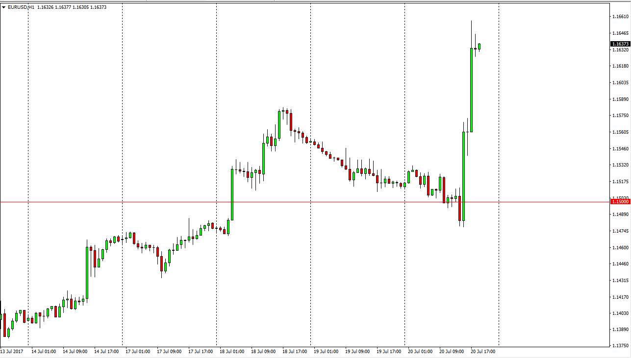 The EUR/USD pair shot through the roof during the day on Thursday, as news came out that investigators are expanding their search into Donald Trump’s global companies for collusion with Russia. Quite frankly, this announcement really wasn’t anything out of the norm, because quite frankly there are plenty of international companies that the man owns. They aren’t suggesting that they are found anything, just that they would consider these companies. As a result, the US dollar sold off rather rapidly, and we have seen an impulsive move to the upside. Nonetheless, this was a technically bullish market anyway, so the reason doesn’t really matter.