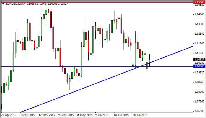 The EUR/USD pair went back and forth during the course of the session on Monday as the referendum announcement in Greece came out. Because of this, we tested the 1.10 level, but it did hold. Because of this, we are still bullish of the Euro, and believe that it’s only a matter of time before the market goes higher. We think that as long as we stay above the 1.09 level, the Euro will continue to show a certain amount resiliency that cannot be ignored. Nonetheless, expect quite a bit of volatility regardless.