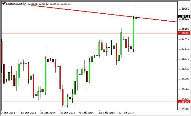 The EUR/USD pair broke above a downtrend line during the session on Friday, but turn things back around and formed a shooting star. Because of this, we feel that the markets probably going to pull back to the 1.38 level, where it should find plenty of support. If it does in fact find support there, we would be buyers as it should show that the Euro is ready to break out overall. A break of the top of the shooting star is also a strong buy signal as it breaks resistance from the downtrend line from the channel that has been falling since the financial crisis began.