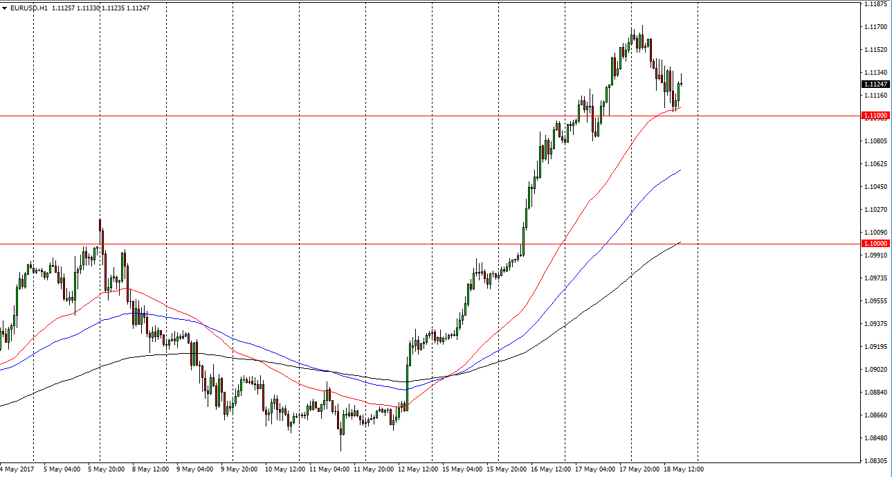The EUR/USD pair fell initially during the day on Thursday, as we reached down to the 1.11 level underneath. That is an area that has previously been resistive, and now it should be supportive. We also have the 24-hour moving average just below offering support, but it does look like we need to consolidate in this area to pick up enough momentum to continue going higher. If we were to break down below the 1.1080 level, the market should then go down to the 1.10 level under that. Ultimately, the EUR/USD pair is reacting to the French election and the stability and the European Union as far as politics is concerned, so it makes sense that we would continue to see bullish pressure. It is also reacting to the political drama and the United States which seems to be never-ending.