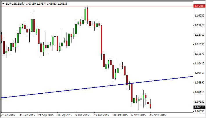 The EUR/USD pair initially gapped lower at the open on Monday, mainly as a knee-jerk reaction to the Parisian terror attacks in our opinion. However, we feel that gap and then ended up forming a relatively negative candle. At this point time, if we can break down below the recent low, this market should then head to the 1.06 handle, and then the 1.05 handle. We think rallies will be selling opportunities as well, as breaking below the bottom of the uptrend line recently of course was a very negative sign in this market.