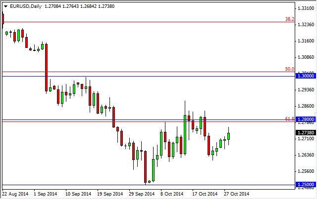 Looking at the chart though, I cannot help but notice that the 1.28 level is the beginning of significant bearish pressure, pain all the way to the 1.30 handle. I have been suggesting this for some time, and there is nothing on this chart that even remotely suggests that it’s about the change. I believe ultimately some type of resistant candle in this vicinity will be an excellent selling opportunity as we break the bottom of what looks like a bearish flag, and the perhaps head down to the 1.25 level during the next several days.