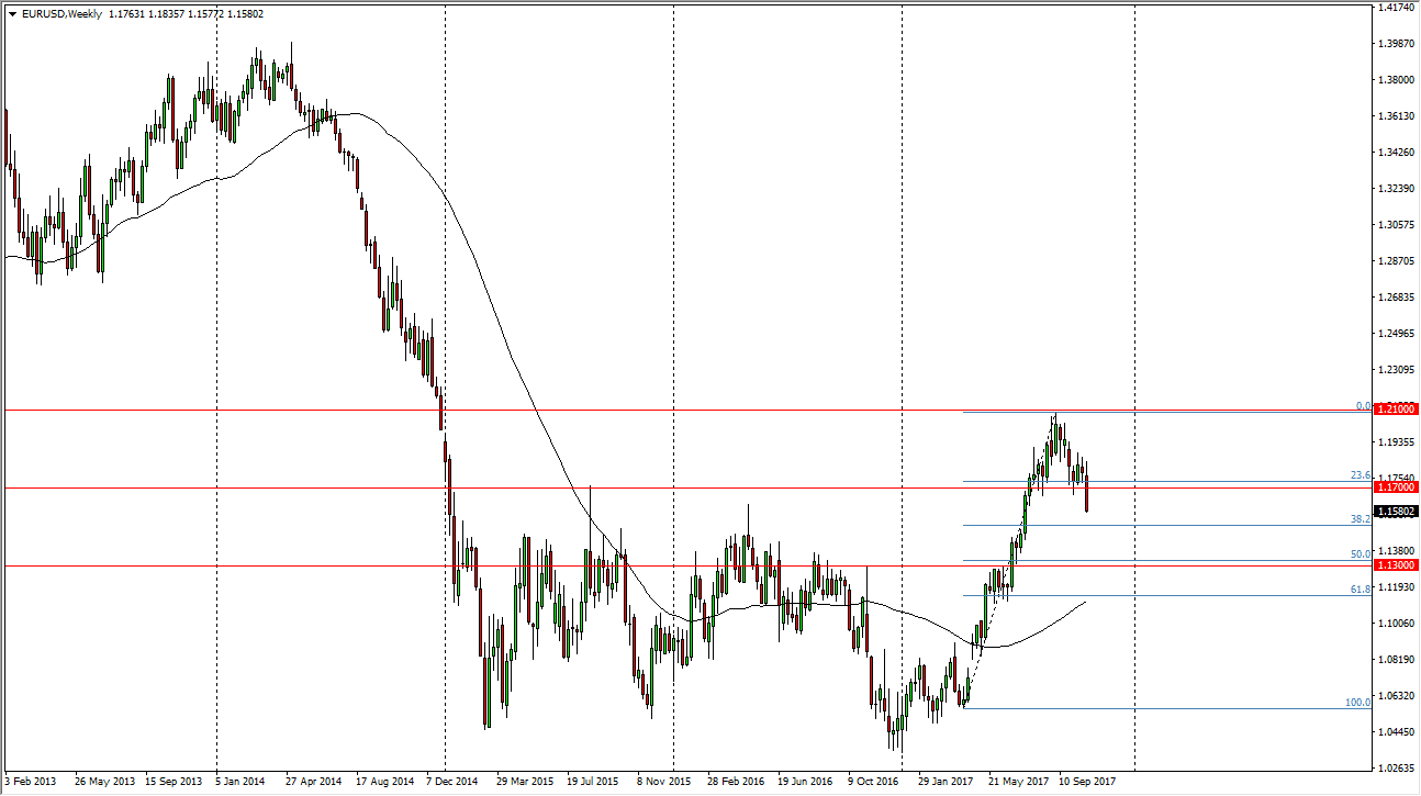 The EUR/USD pair initially tried to rally during the week but then broke down significantly. This accelerated on Thursday, as Mario Draghi suggested that the European Central Bank would continue to extend its quantitative easing program, although at a slower pace. However, this is more dovish than hawkish, and of course of the same time we have the Federal Reserve looking to raise interest rates over the next several months, and that continues to put bullish pressure on the US dollar. I think that the 1.13 level will probably be targeted underneath, as it is the 50% Fibonacci retracement level, and of course on the daily chart we have seen a head and shoulders breakdown, which measures to that level. I believe that the market needs to cool off after the massive move to the upside, and it makes sense that this pullback happens, as it could give us a bit of value in the Euro longer term.