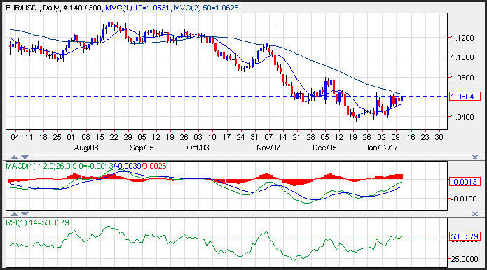 The EUR/USD edged higher on Wednesday, following a report from the EU institute that said investment was poised to outpace consumption. The currency pair was unable to break through resistance near the 50-day moving average at 1.0625. Support on the currency pair is seen near the 10-day moving average at 1.0531. The exchange rate continues to form a bottom, as momentum remains positive with the MACD (moving average convergence divergence) index prints in the black with an upward sloping trajectory which points to a higher exchange rate.