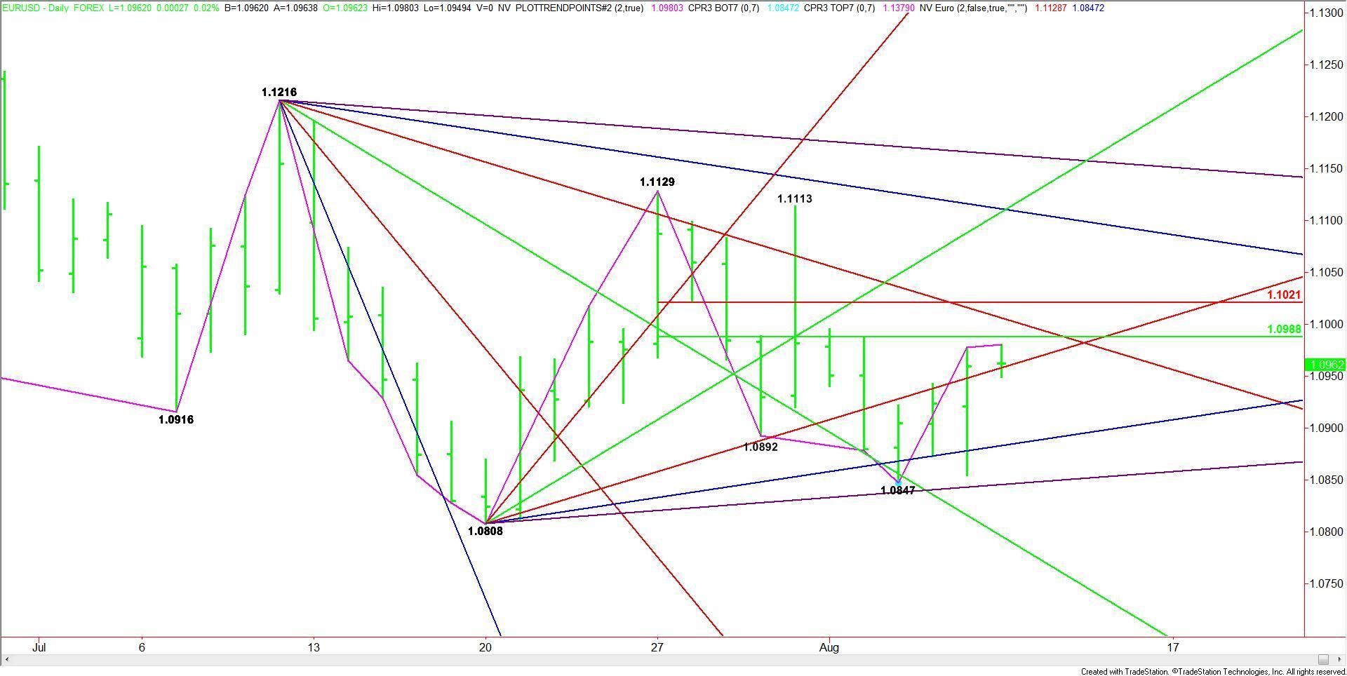 The main trend is down on the daily swing chart. The main range is 1.1129 to 1.0847. Its retracement zone at 1.0988 to 1.1021 is the primary upside target. A downtrending angle passes through this zone at 1.1006, making it a valid upside target also.