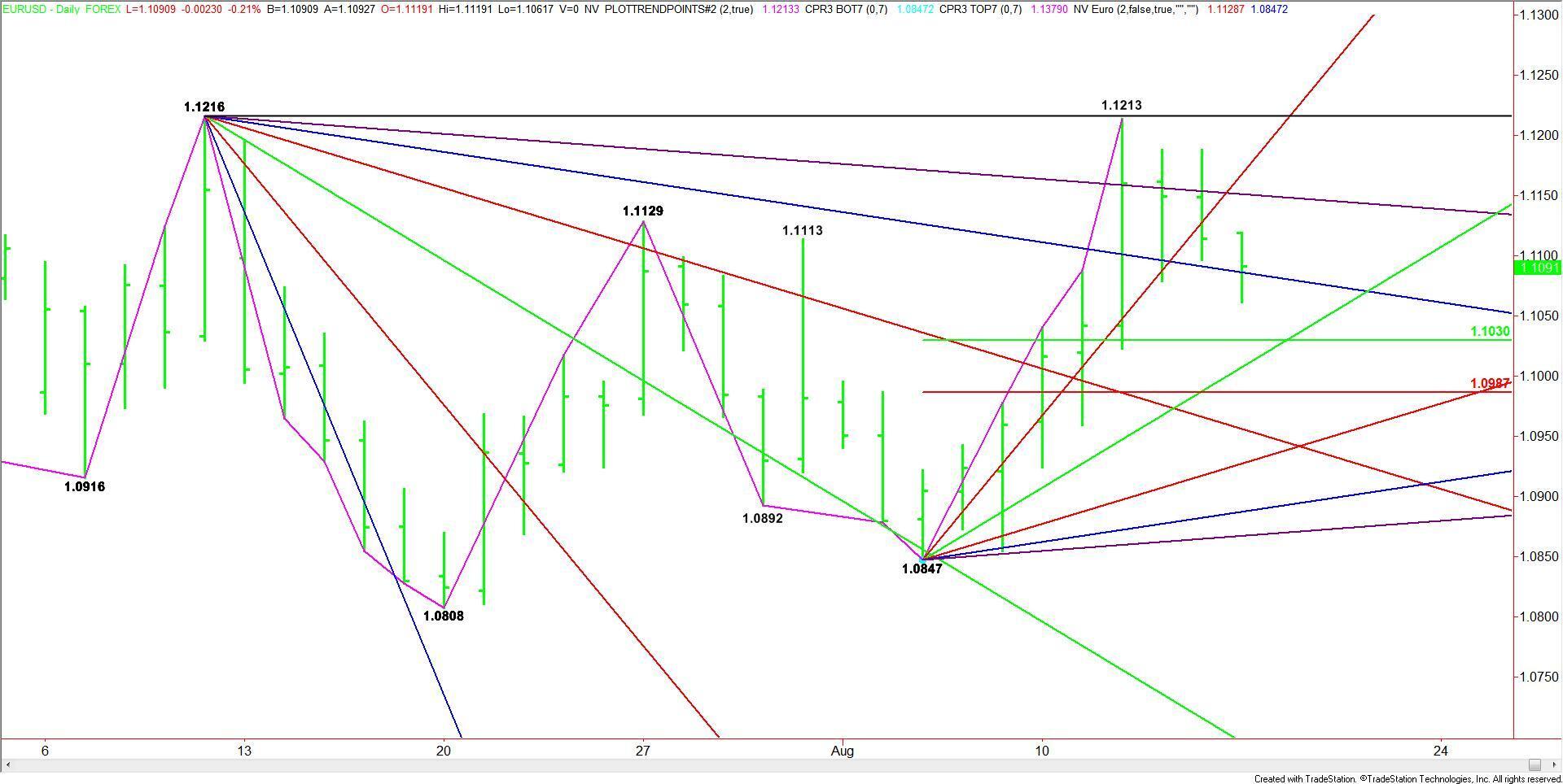On Friday, the Forex pair closed below a steep uptrending angle that had been guiding the market higher since August 5. This gave the market a downside bias on the opening. The selling was strong enough to cross to the weak side of a downtrending angle at 1.1086. However, buyers came in to recover this angle.