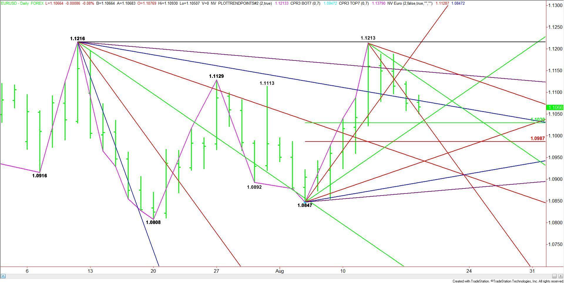 Daily EUR/USD Technical Analysis The EUR/USD is trading lower at the mid-session. The market is trading on the weak side of a long-term downtrending angle