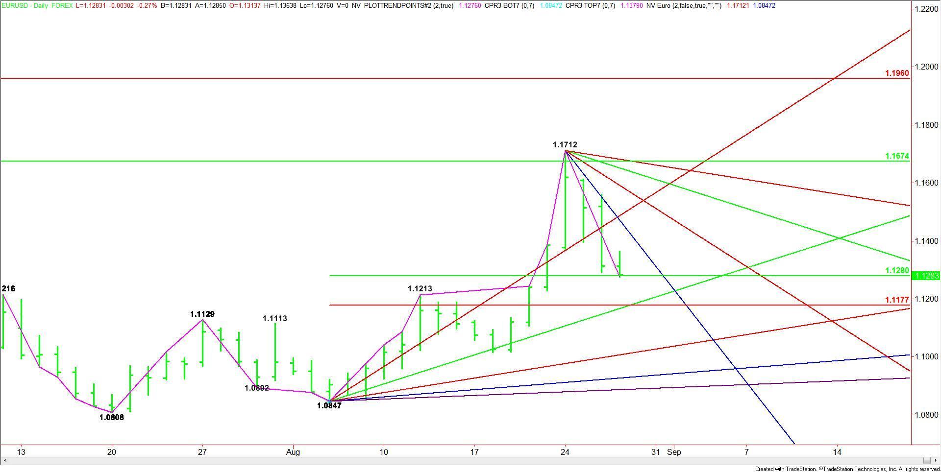 A sustained move over 1.1283 will signal the presence of buyers. This could create enough upside momentum to challenge the main top at 1.1364 and the 50% level at 1.1365. This is followed closely by an uptrending angle at 1.1372.
