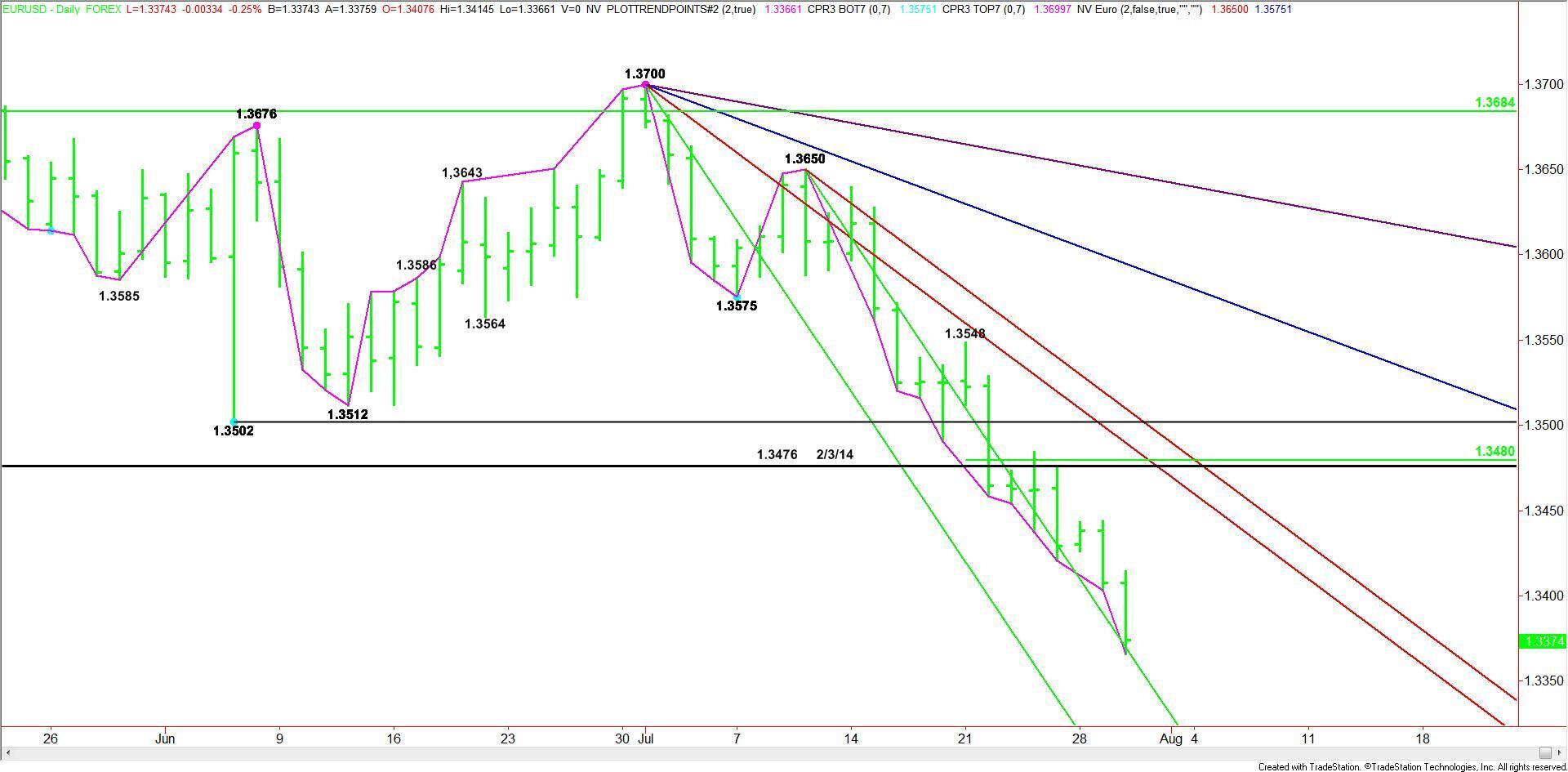 Today’s stronger-than-expected U.S. Gross Domestic Product report is pressuring the EUR/USD at the mid-session. The market is currently testing a downtrending angle on the daily chart at 1.3370. This angle is moving down .002 per day. Crossing to the weakside of this angle will put the market in an extremely weak position.