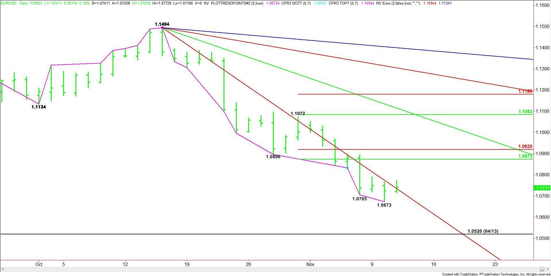 The main trend is down according to the daily swing chart. The early price action, however, has made 1.0673 a new minor bottom. The new minor range is 1.0673 to 1.0773, which makes 1.0723 a minor pivot and potential intraday support.