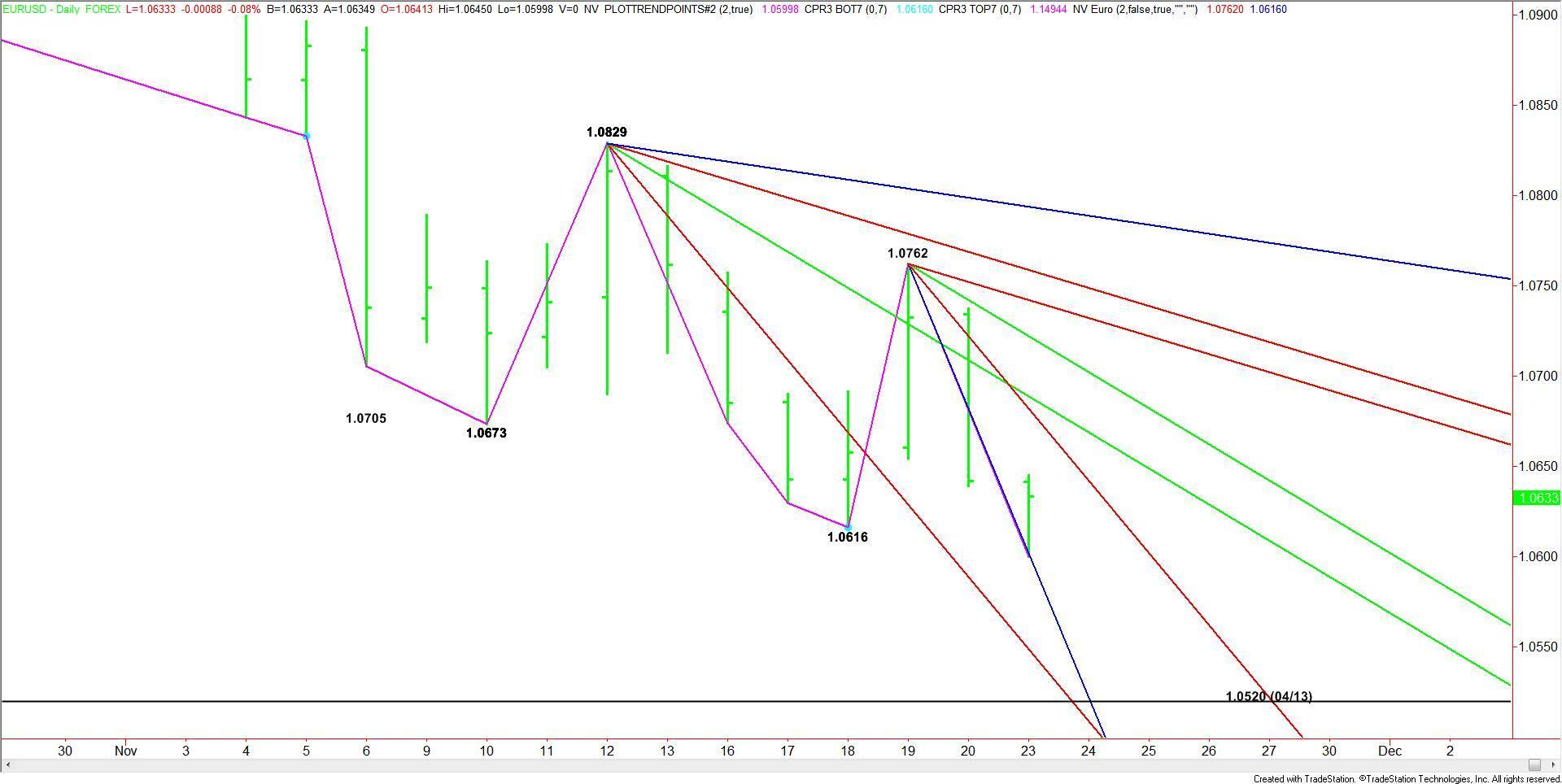 Based on the current price at 1.0632, the EUR/USD is now in a position to form a potentially bullish closing price reversal bottom. This will occur on a close over 1.0642. The direction of the market into the close today will be determined by trader reaction to this price.