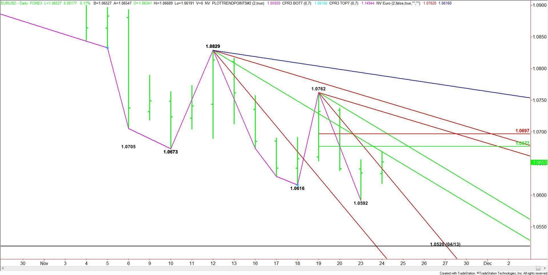 The EUR/USD is trading higher at the mid-session. The main trend is down according to the daily swing chart, but the early price action has made 1.0592 a new minor bottom.
