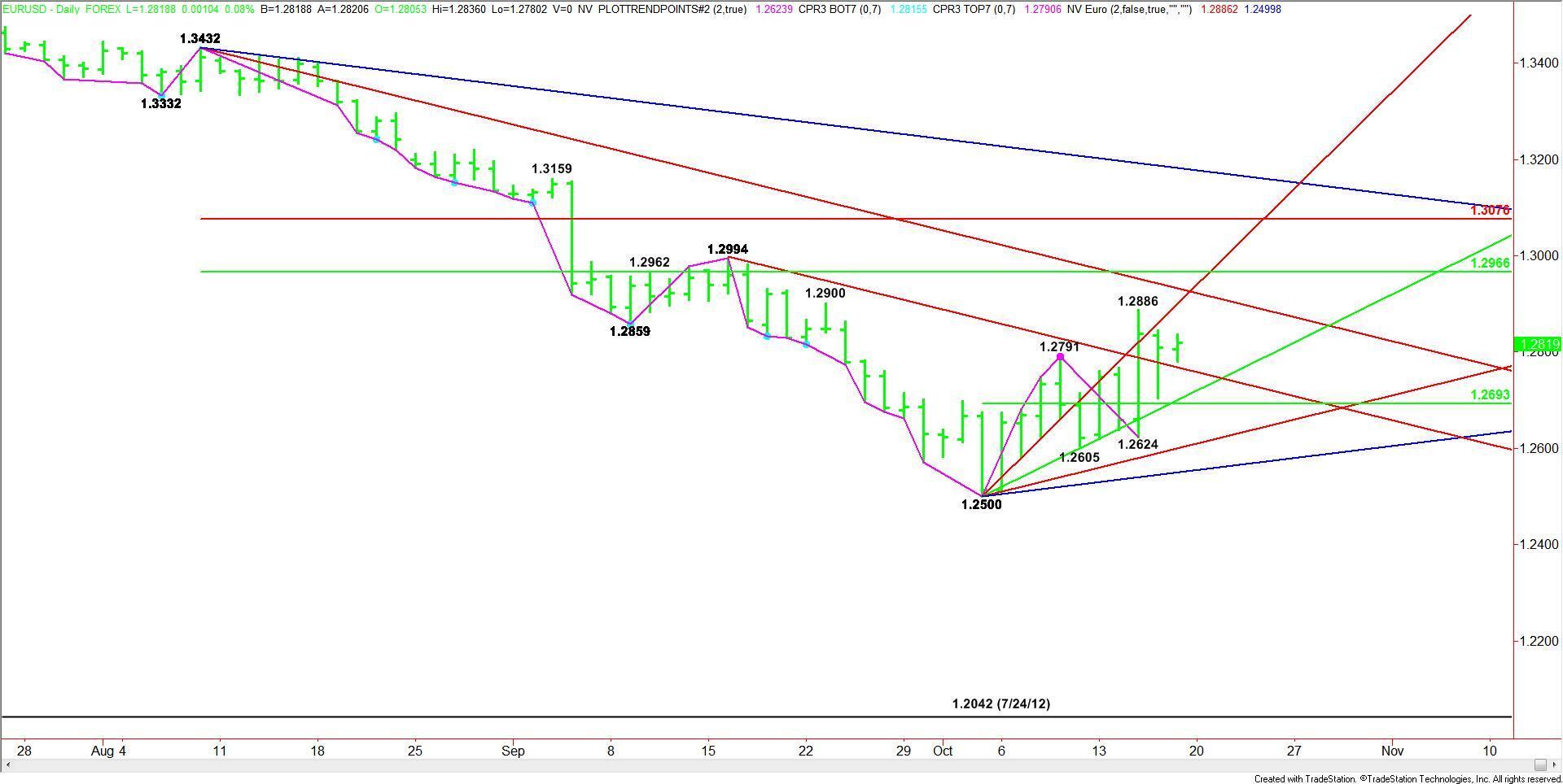 Daily EUR/USD Technical Analysis The main trend is up on the daily chart. The trend will be reaffirmed when 1.2886 is taken out. It will be changed back