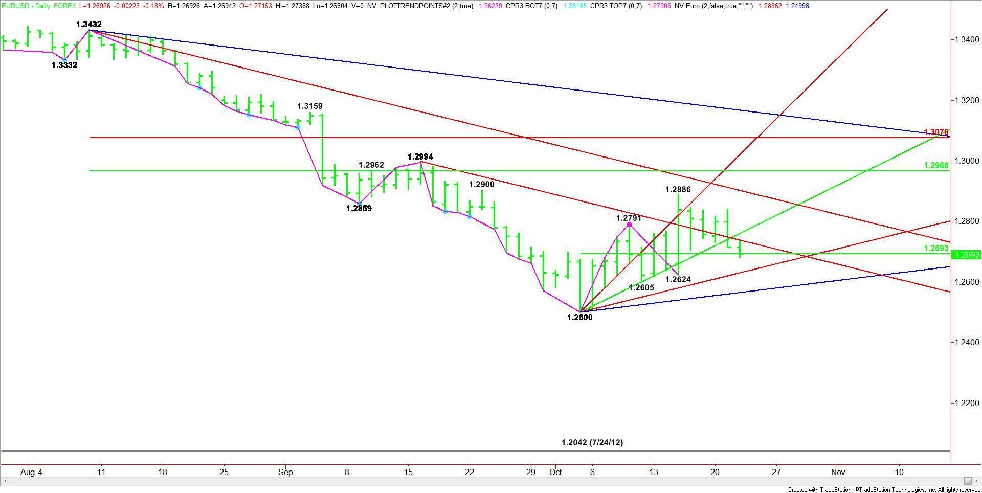 Earlier in the session, the EUR/USD changed the main trend to up when it crossed the former top at 1.2730. Although there was a follow-through move to 1.2739, buyers failed to support the move and the main trend turned back to down on a trade through 1.2720.