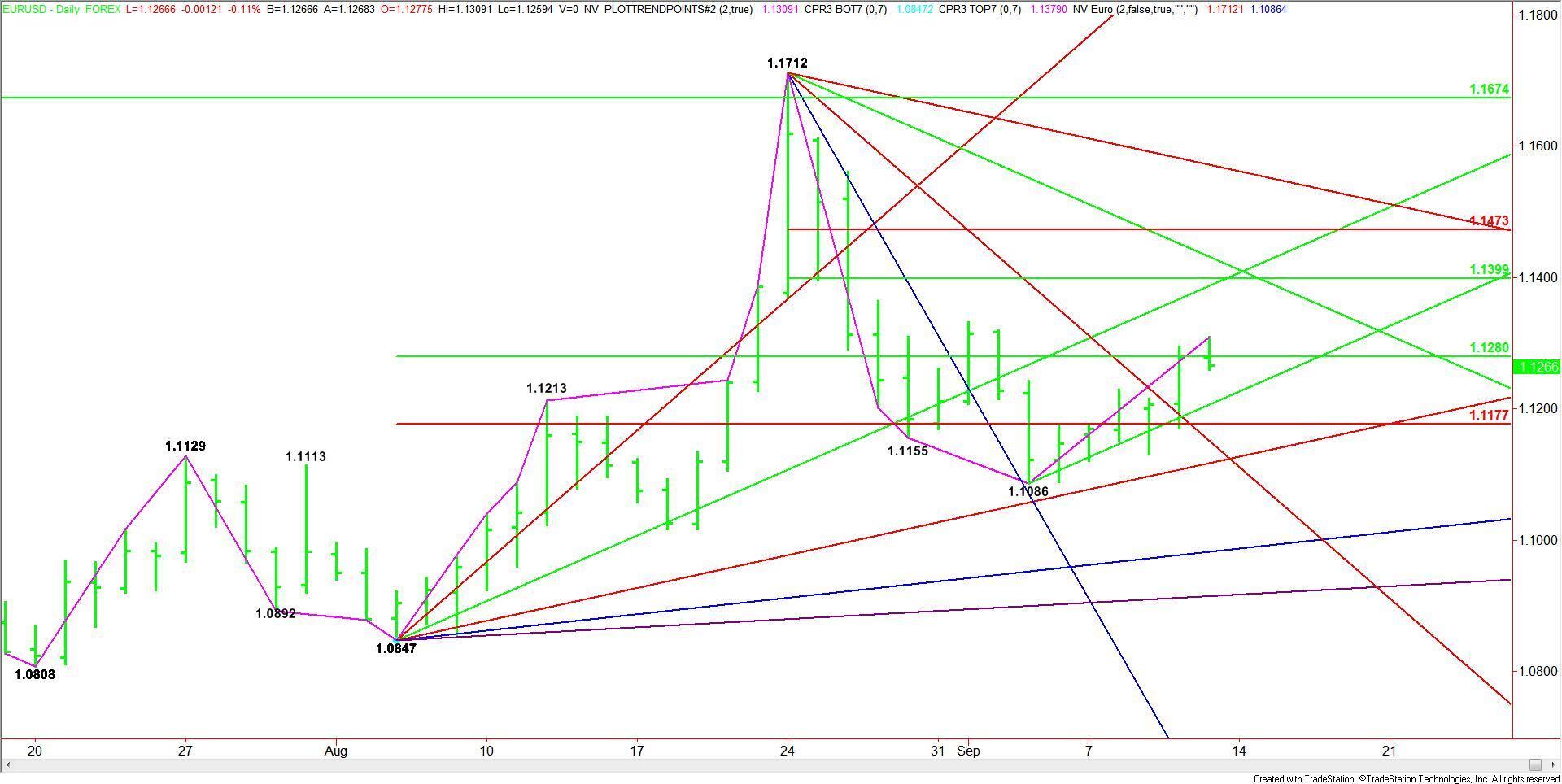 The EUR/USD is trading slightly lower at the mid-session. The range is tight, and volume and volatility are below average. Most of the major players are on the sidelines today and are expected to remain there until the release of the Fed’s interest rate decision on September 17.