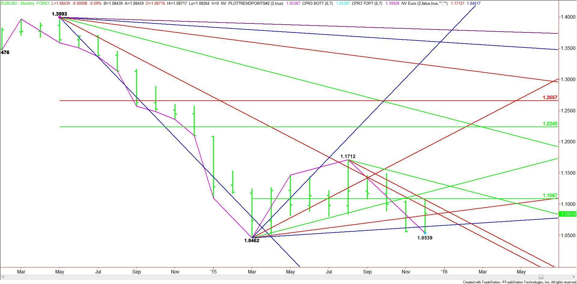 Technically, the main trend is down according to the monthly swing chart. However, the December closing price reversal bottom at 1.0539 has temporarily stopped the recent four month break. A trade through 1.1059 will confirm the potentially bullish chart pattern. This could lead to further short-covering in January, but it shouldn’t lead to a change in trend. This will only occur on a breakout over 1.1712.