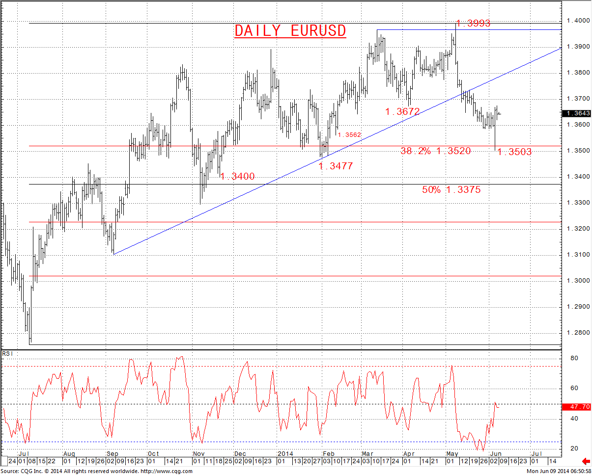 The Thursday plunge to hit our longer term retrace target at 1.3520 leaves bearish pressures intact into mid-June (although we see a strong bias that a low is in place at least through mid-month).
