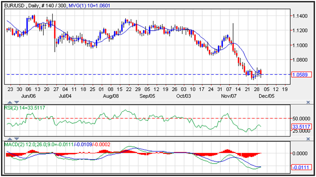 The EUR/USD consolidated after recapturing the 10-day moving average, but moved lower during the U.S. trading session following a stronger than expected ADP employment report. Support is seen near the 10-day moving average at 1.0601. Additional support on the currency pair is seen near the November lows at 1.0517. Resistance on the currency pair is seen near the October lows at 1.0850. Momentum has turned positive as the MACD (moving average convergence divergence) index generated a crossover buy signal. This occurs as the spread (the 12-day moving average minus the 26-day moving average) crosses above the 9-day moving average of the spread.