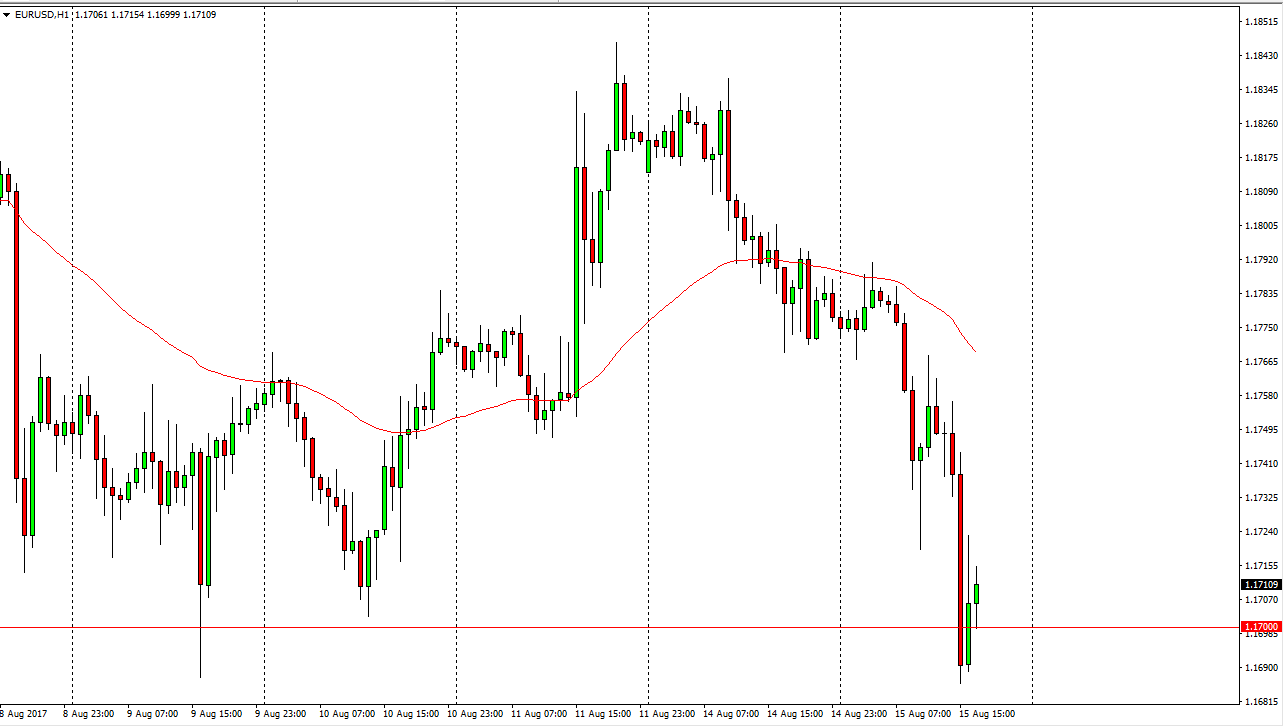 The EUR/USD pair fell rather significantly during the session on Monday, and accelerated to the downside after the US retail sales figures candle stronger than anticipated. However, looks as if the 1.17 level is trying to hold, and if it does, that would be a very positive sign. The market is one that I prefer to buy anyway, so this bounce could be the beginning of something special. Alternately, if we were to break down below the 1.1675 handle, then I think the market probably goes back down to the 1.15 handle where ice even more support. I believe that most currency traders are looking at the European Central Bank as one that’s going to be tightening, while the Federal Reserve, although tightening in the near-term, most traders are a bit skeptical of.