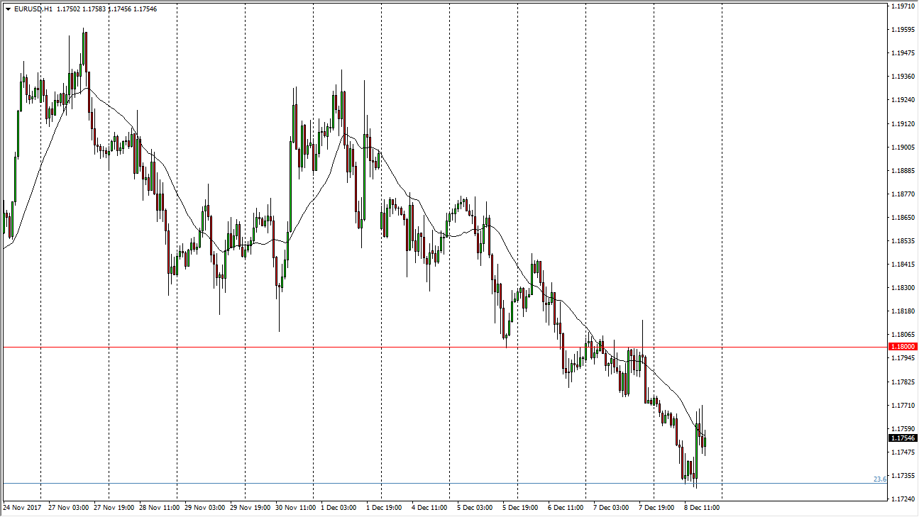 The EUR/USD pair was slightly negative during the trading session on Friday, reaching down towards the 1.1733 level. I believe that we are consolidating between the 1.17 level underneath, and the 1.18 level above. I think that eventually we will break above the 1.18 level, sending this market to the much higher, perhaps finally breaking towards the 1.21. In general, I believe that this is a market that should be bullish, especially considering that the weekly chart looks to be forming a massive bullish candle. I think pullbacks offer value, and given enough time we can eventually find buyers to jump in. We have seen a significant amount of bullish pressure over the year, and I think that the market should continue to be one that suffers from volatility.