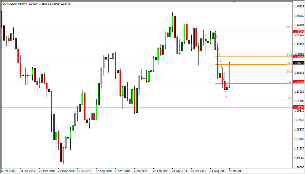 The EUR/USD pair rose violently over the course of the week as traders pinned their hopes on some kind of solution for the EU debt issues. The weekend has