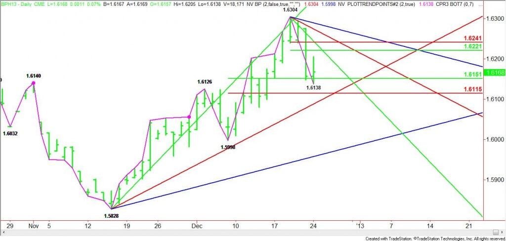The market basically bounced off of a 50% level created by the 1.5998 to 1.6304 range at 1.6151. A failure to hold this level later today could mean a test of the Fibonacci level at 1.6115. This level is likely to be tested on December 26 or 27 when an uptrending Gann angle from the 1.5828 bottom comes in at 1.6098 and 1.6108 respectively.