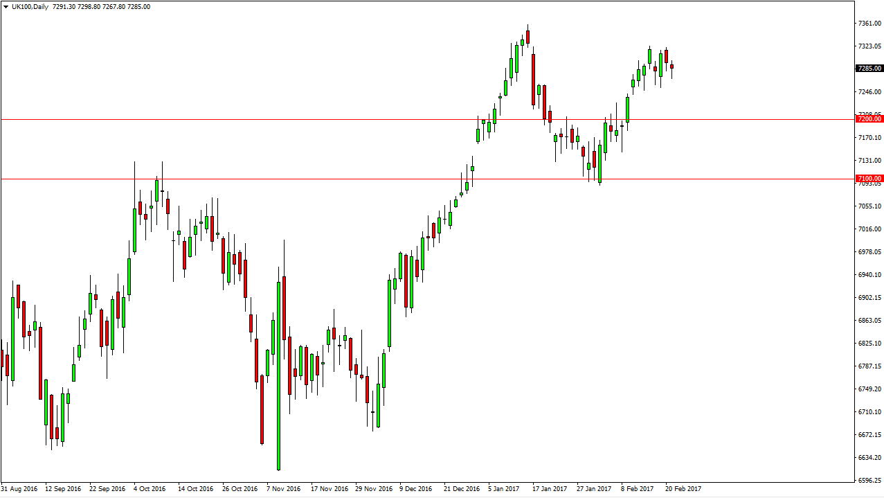 The FTSE 100 initially fell on Tuesday but turned around to form a hammer like candle. Because of this, I believe that the market continues to go higher and will not only reach towards the 7350 handle, but perhaps make a fresh, new high. This is a market that’s been a very bullish one for some time, and the pull back down to the 7100 level just offered value that people were interested in. I believe that the FTSE 100 continues to go much higher, and I have no interest whatsoever in selling.
