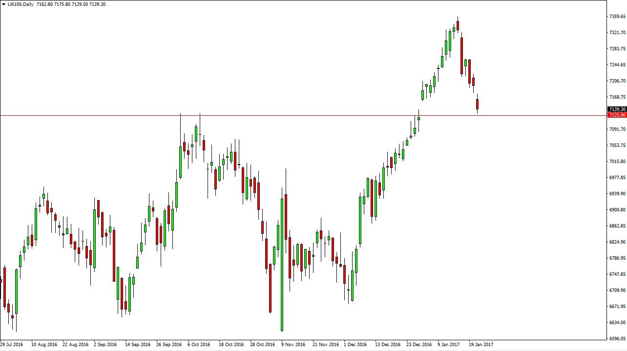 The FTSE 100 fell on Monday, after gapping lower. It appears that the 7125 handle is offering quite a bit of support though, as it was the site of a