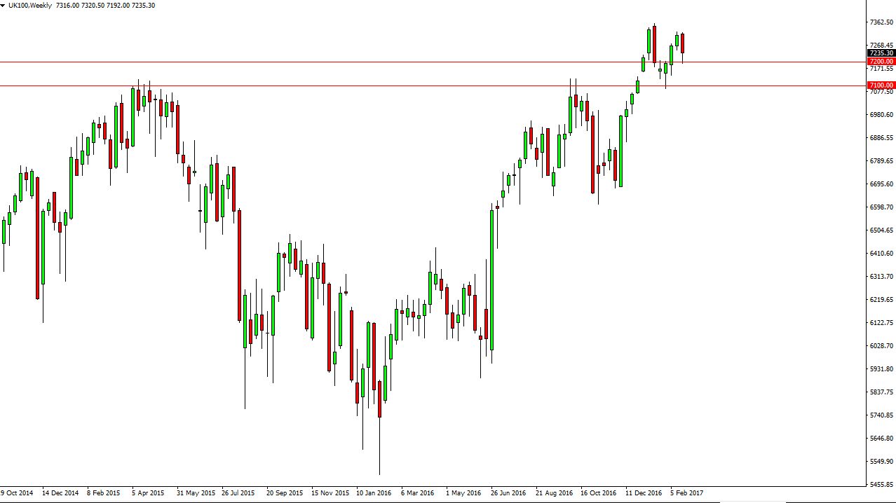 The FTSE 100 fell during the course of the week, reaching towards the 7200 level. We found enough support there to bounce though, and I think it’s only a