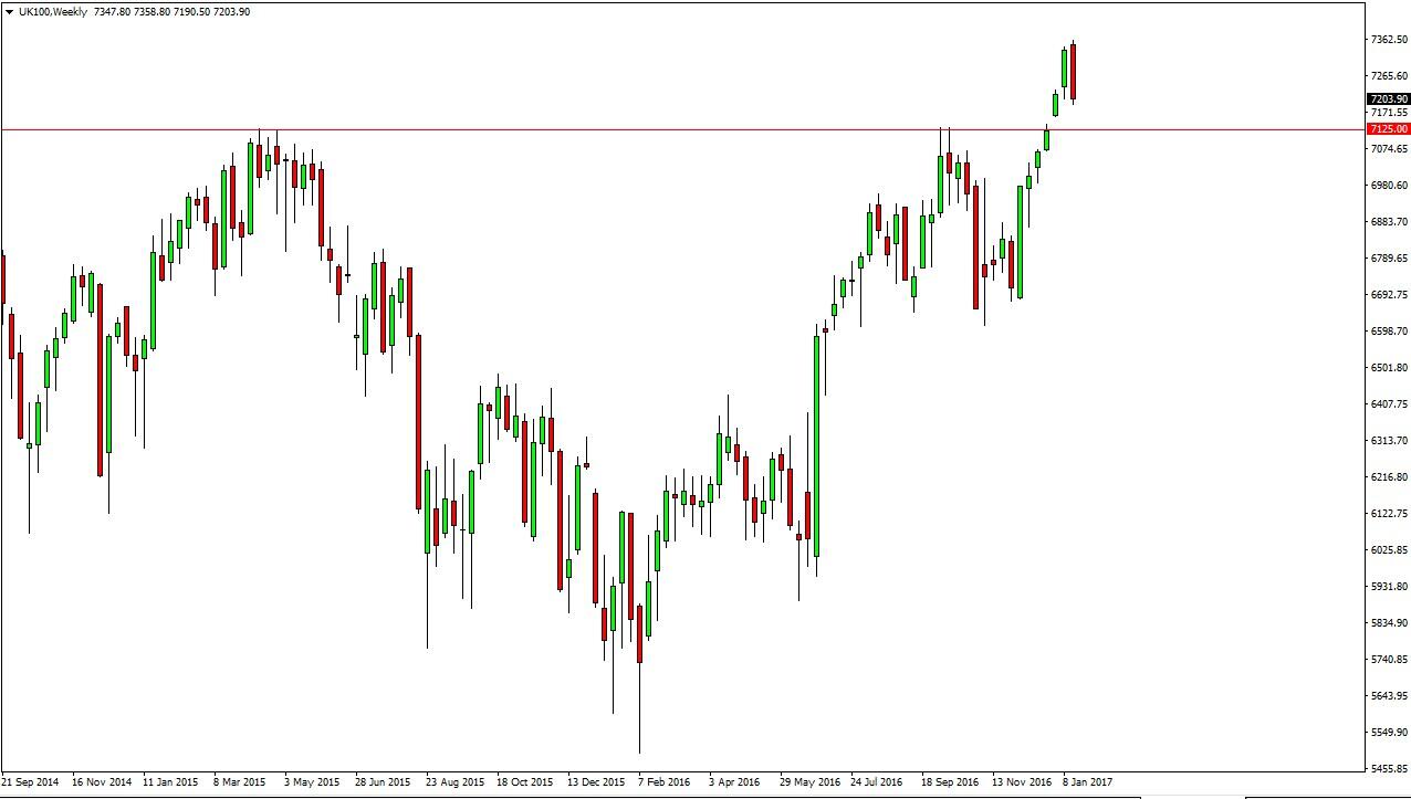 The FTSE 100 fell during the week, forming an outside bearish candle. While normally a sell signal, I still see a significant amount of support near the 7125 handle, so if we can form some type of support of candle there, I feel that the market will turn around and continue to go higher. I don’t really have any interest in selling, this is a market that seems to have quite a bit of bullish pressure underneath, and I still believe that the following British pound will benefit the FTSE 100 longer-term.