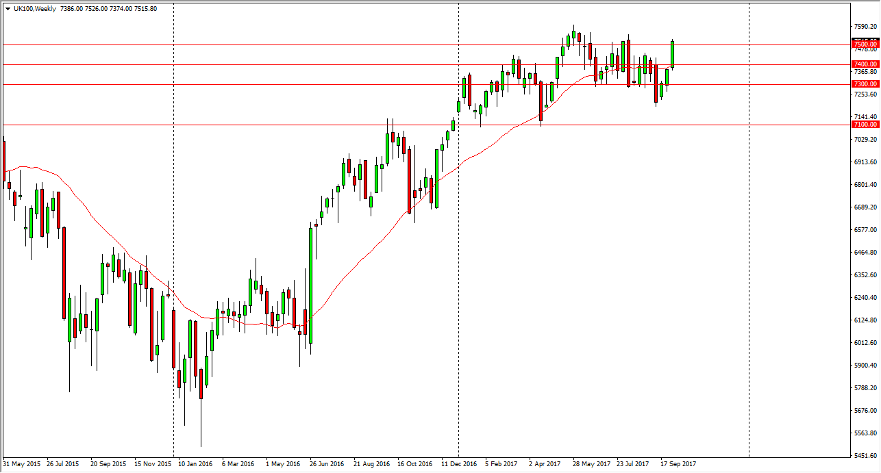 The FTSE 100 exploded to the upside during the sessions that made up the previous week, breaking above the 7500 level. That’s a very bullish sign, and I