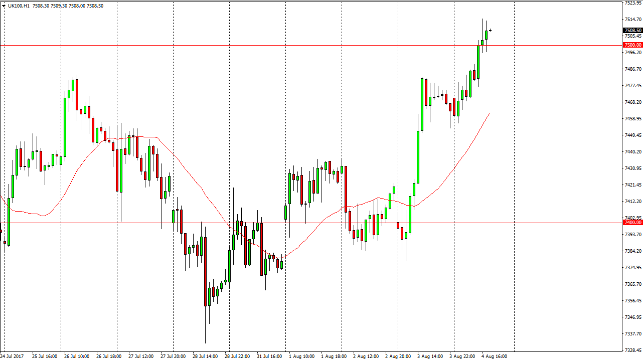The FTSE 100 exploded to the upside on Friday, slicing through the 7500 level. It’s a good sign that we broke above that level, now I think that the market could continue to go much higher. Pullbacks should continue to be buying opportunities as the FTSE shows overall strength. This was started on Thursday, and now that we have continued this impulsive move, I believe that every time the market pulls back it’s going to be a buying opportunity. This is predicated on the idea that the US dollar strengthening should make the British pound softer, and that should help with exports.