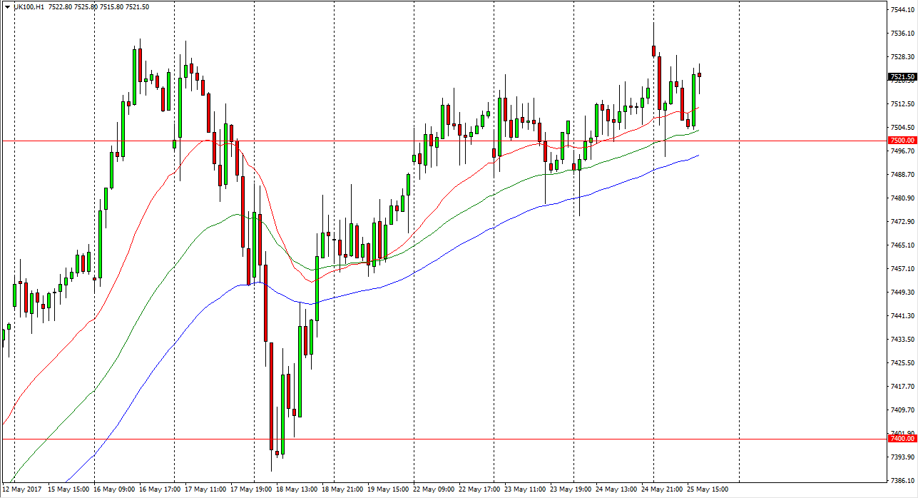 The FTSE 100 initially gapped higher at the open on Thursday, and then reached much higher from there. We turned around to form a shooting star on the hourly chart, and then fell significantly. The 7500-level underneath continues to be important, just as the moving averages are that I follow as well. I believe that the market is going to continue to grind higher, so therefore buying dips will probably be the best way to trade this market as we are trying to break out above a significant resistance barrier. Once we cleared the 7535 handle, I think that the market will then reach towards the 7550 handle, and then 7600. This is a market that continues to show quite a bit of bullish pressure, and it now looks as if we are trying to build up enough volume to break out.