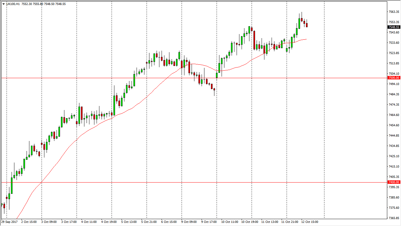 The FTSE 100 gapped lower at the open on Thursday, but turned around to not only fill that gap, but broke out to the upside. By doing so, we reached towards the 7560 handle, an area that caused a little bit of a pullback. However, I think there is more than enough support underneath to continue to grind to the upside. The 7500-level underneath continues to be support, and a bit of a “floor” when it comes to the overall trend now. I think that eventually we will go looking towards the 7600 level, with the FTSE 100 showing bits of volatility that you can take advantage of. Pullbacks offer value, and that’s exactly what I look for in these types of trades. We have a significant amount of momentum to the upside as the 24-hour moving average continues to be supportive, and I think it’s only a matter of time before people go value hunting.
