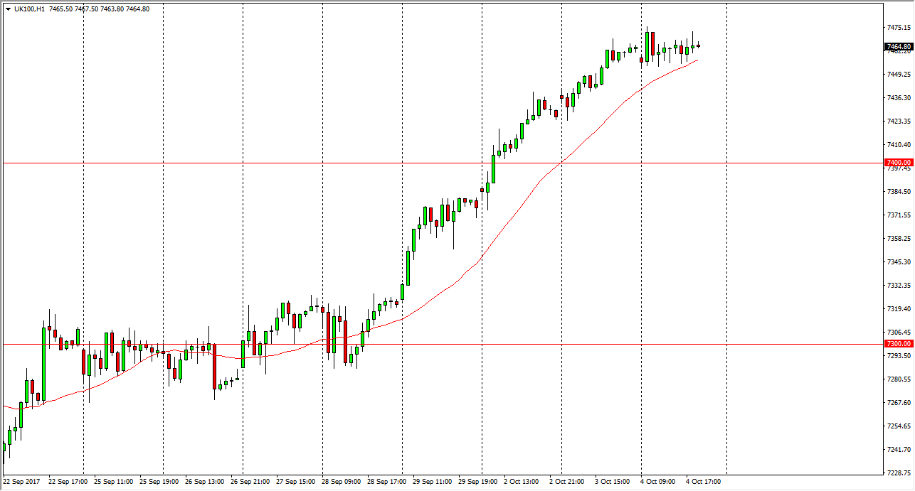 The FTSE 100 had a very sideways session on Wednesday, as we continue to hover just above the 7450 level. I think that we are going to go looking towards