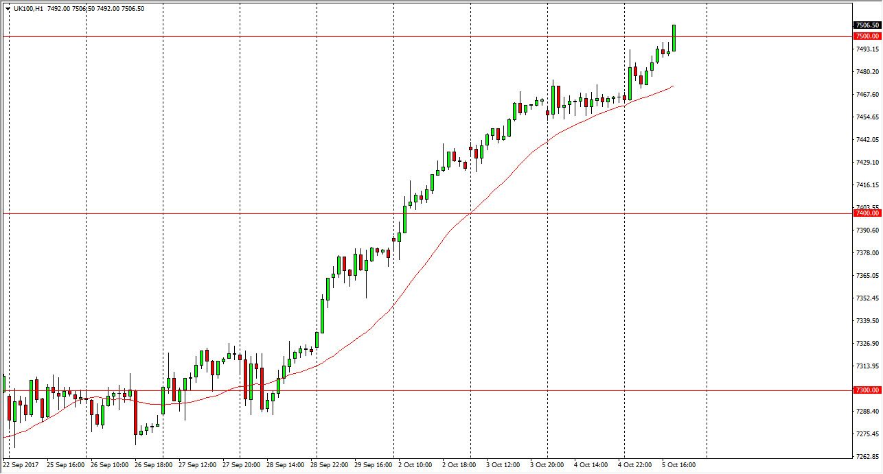 The FTSE 100 rallied on Thursday, using the 24-hour exponential moving average as support. We broke above the 7500 level, which is a very bullish sign, an
