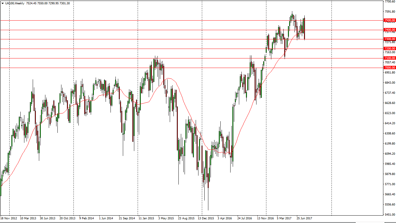 The FTSE 100 fell rather significantly during the week, forming a very bearish engulfing candle. By breaking down to the 7300 level, the market looks very