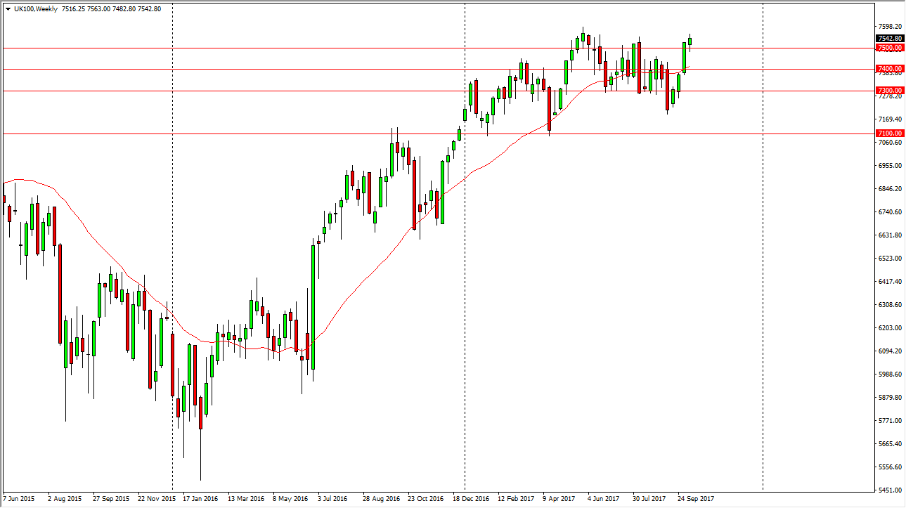 The FTSE 100 initially fell during the week, but then turned around to rally significantly. The 7500 level should now offer support as it was resistance in the past, but I do recognize we could get a bit of volatility as we are a bit overextended currently. I think that eventually we should reach above the 7600 level, and then reach towards much higher levels. I think that these pullbacks that could occur should find plenty of buyers down to the 7300 level, which would be thought of as value. I believe that the FTSE 100 continues to favor the upside as the British pound is historically week. Yes, it has been rallying as of late, but in the end it still makes British exports cheap, which of course helps the FTSE 100 in general.